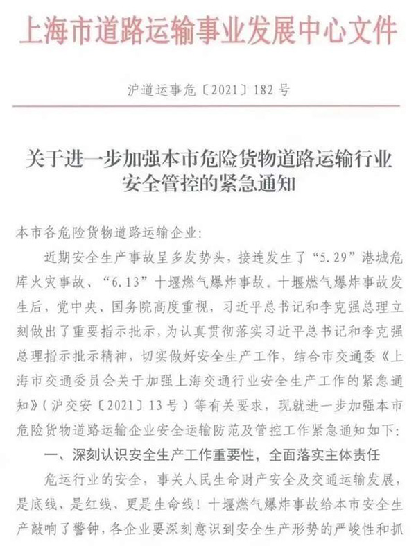 近期安全事故頻發(fā),對(duì)此,上海發(fā)布關(guān)于進(jìn)一步加強(qiáng)本市危險(xiǎn)貨物道路運(yùn)輸行業(yè)安全管控的緊急通知,暫停一切非必要的危險(xiǎn)貨物運(yùn)輸。