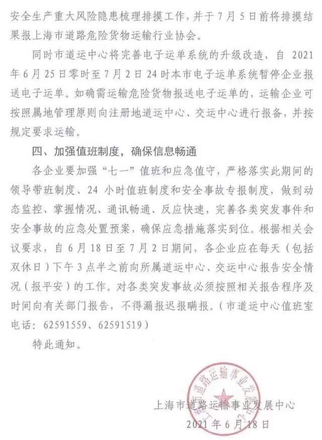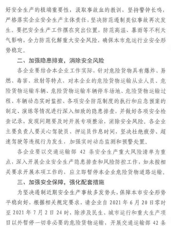 為堅(jiān)決遏制近期安全事故多發(fā)勢(shì)頭,保障上海市安全形勢(shì)平穩(wěn)向好,根據(jù)相關(guān)規(guī)定要求,請(qǐng)企業(yè)自2021年6月20日零時(shí)至2021年7月2日23時(shí),除涉及民生、城市運(yùn)行和重大生產(chǎn)項(xiàng)目以外暫停一切非必要的危險(xiǎn)貨物運(yùn)輸,開展交通運(yùn)輸部42條安全生產(chǎn)重大風(fēng)險(xiǎn)隱患梳理摸排工作,并于7月5日前將摸排結(jié)果報(bào)上海市道路危險(xiǎn)貨物運(yùn)輸行業(yè)協(xié)會(huì)。