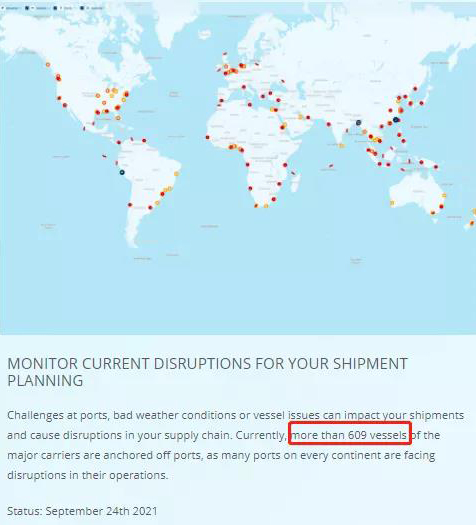 根據(jù)集裝箱運(yùn)輸平臺(tái)Seaexplorer的最新數(shù)據(jù),由于各大洲的港口都面臨著運(yùn)營中斷的情況,截至9月24日,有超過609艘承運(yùn)船只在港口外停泊。